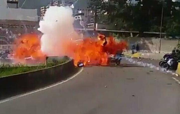 Βίντεο έχει καταγράψει τη στιγμή που μία βόμβα τοποθετημένη στην άκρη του δρόμου στην πρωτεύουσα Καράκας, ενεργοποιείται και τινάζει κυριολεκτικά στον αέρα αστυνομικούς, οι οποίοι διασχίζουν τον δρόμο με τις μηχανές τους.