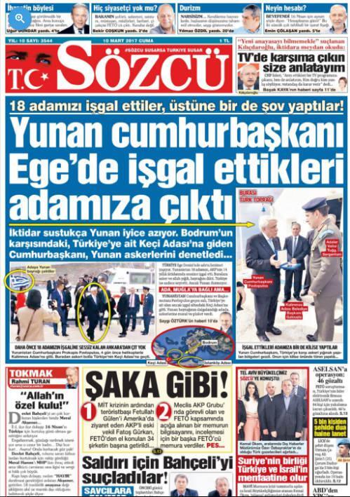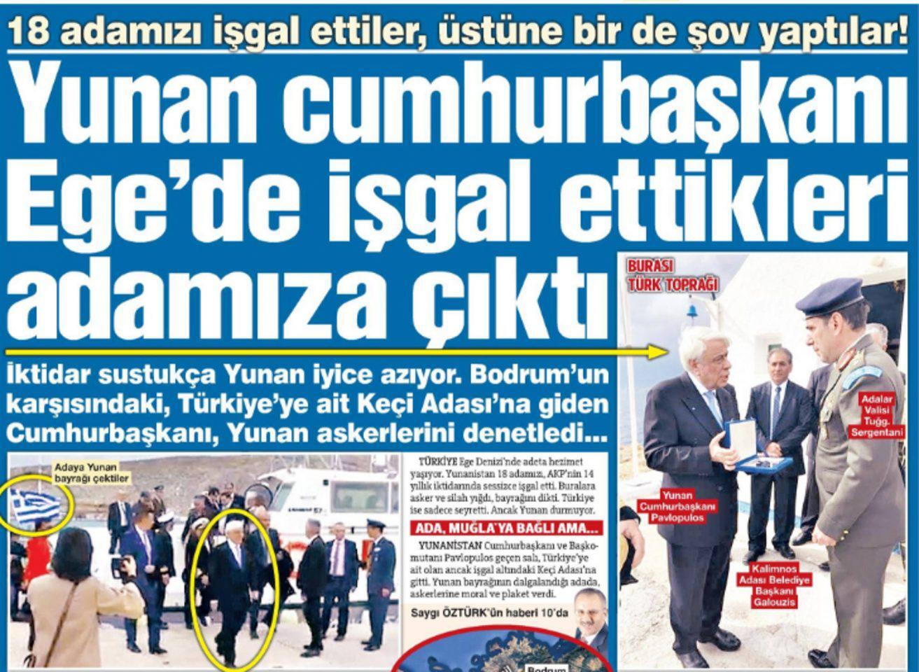 «O Έλληνας πρόεδρος ανέβηκε στο νησί μας, το οποίο κατέλαβαν. Μας πήραν τα 18 νησιά μας και από πάνω κάνουν και σόου», αναφέρει η εφημερίδα η οποία σε ένα ανιστόρητο παραλήρημα διεκδικεί ελληνικά εδάφη.