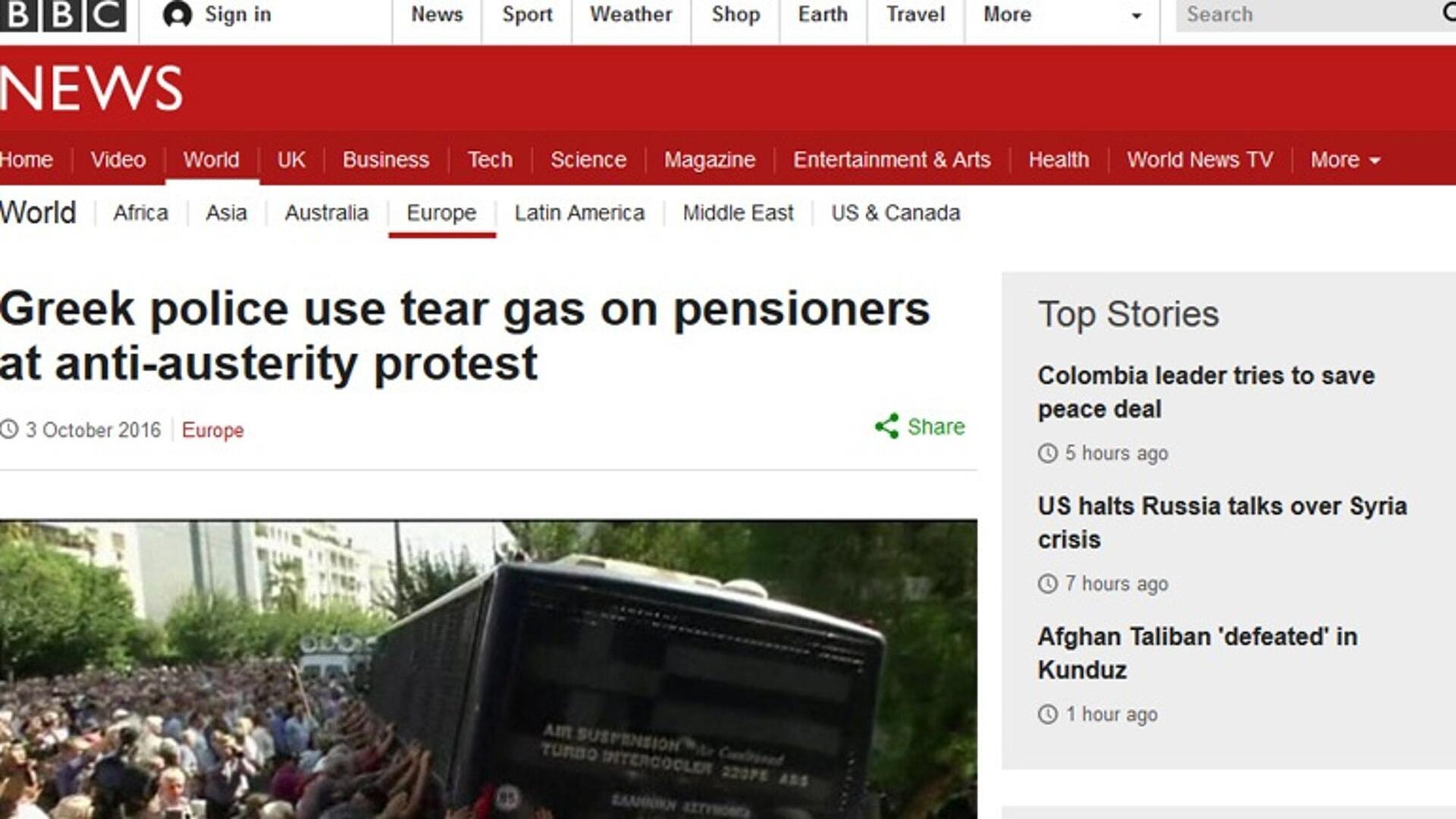 Εκτενές άρθρο για τη χθεσινή ρίψη χημικών από δυνάμεις των ΜΑΤ στην διαδήλωση των συνταξιούχων φιλοξενεί στην ιστοσελίδα του το ΒΒC.