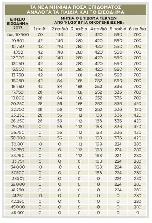 Για παράδειγμα: Οικογένεια με ένα παιδί που δήλωσε εισόδημα 9.500 ευρώ, το 2017, αλλά φορολογήθηκε βάσει τεκμαρτού εισοδήματος 12.000 ευρώ (λόγω σπιτιού, Ι.Χ., ή ενός δεύτερου -πατρικού- ακινήτου), δεν θα πάρει το επίδομα που αναλογεί στο εισόδημα των 9.500 ευρώ, αλλά αυτό που αναλογεί στο εισόδημα των 12.000 ευρώ και ας μην είναι πραγματικό. Αντί για 70 ευρώ το μήνα που θα έπαιρνε αν λαμβανόταν υπόψη το εισόδημα των 9.500 ευρώ, θα λάβει 42 ευρώ. Αν έχει δυο παιδιά θα πάρει 140 ευρώ, είτε με τα 9.500 ευρώ εισόδημα είτε με τα 12.000 ευρώ τεκμαρτό εισόδημα. Αν όμως το τεκμαρτό βγει πάνω από 12.000 ευρώ τότε θα πάρει 84 ευρώ για δυο παιδιά και όχι 140.