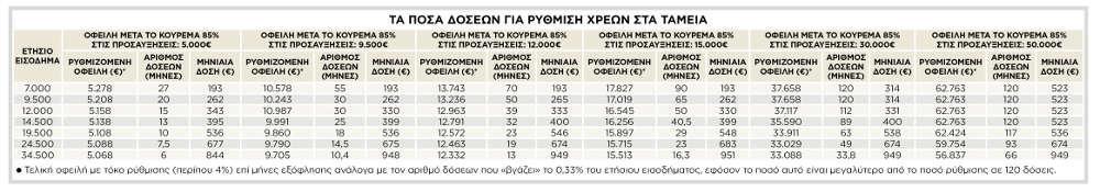 Αν όμως το 33% του εισοδήματος βγάζει μεγαλύτερη δόση, τότε θα επιλέγεται το μεγαλύτερο ποσό και οι δόσεις θα κουρεύονται.