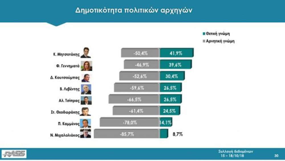 Στις δημοτικότητες των πολιτικών αρχηγών προηγείται ο Κυριάκος Μητσοτάκης με 41,9%, στη δεύτερη θέση βρίσκεται η Φώφη Γεννηματά με 39,6% και ακολουθούν: