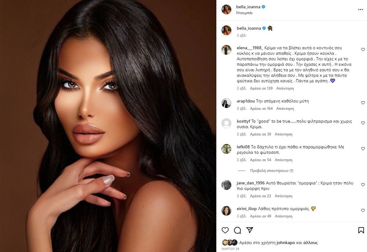Η Ιωάννα Μπέλλα, η οποία ζει και εργάζεται στο Ντουμπάι, το 2018 είχε εκπροσωπήσει την Ελλάδα στον διαγωνισμό «Miss Universe», και είχε δηλώσει συμμετοχή και στο ριάλιτι GNTM, σήμερα προκαλεί σωρεία αρνητικών σχολίων λόγω της εμφάνισής της.