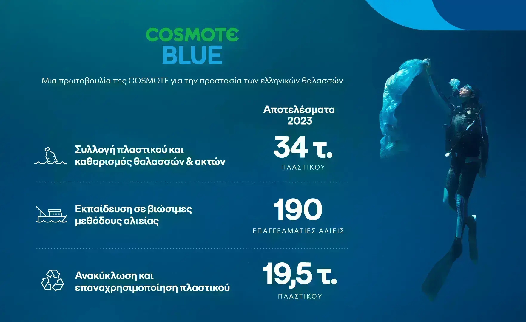 Από την έναρξη της πρωτοβουλίας COSMOTE BLUE επαγγελματίες αλιείς πραγματοποίησαν δράσεις καθαρισμού και συγκέντρωσαν 34 τόνους πλαστικού από τις θαλάσσιες περιοχές και ακτές του Θερμαϊκού, της Χαλκιδικής και του Αργοσαρωνικού κόλπου, με 40 αλιευτικά σκάφη. Επίσης, 190 επαγγελματίες ψαράδες εκπαιδεύτηκαν σε βιώσιμες μεθόδους αλιείας και σε καλές πρακτικές καθαρισμού των θαλασσών και των ακτών.