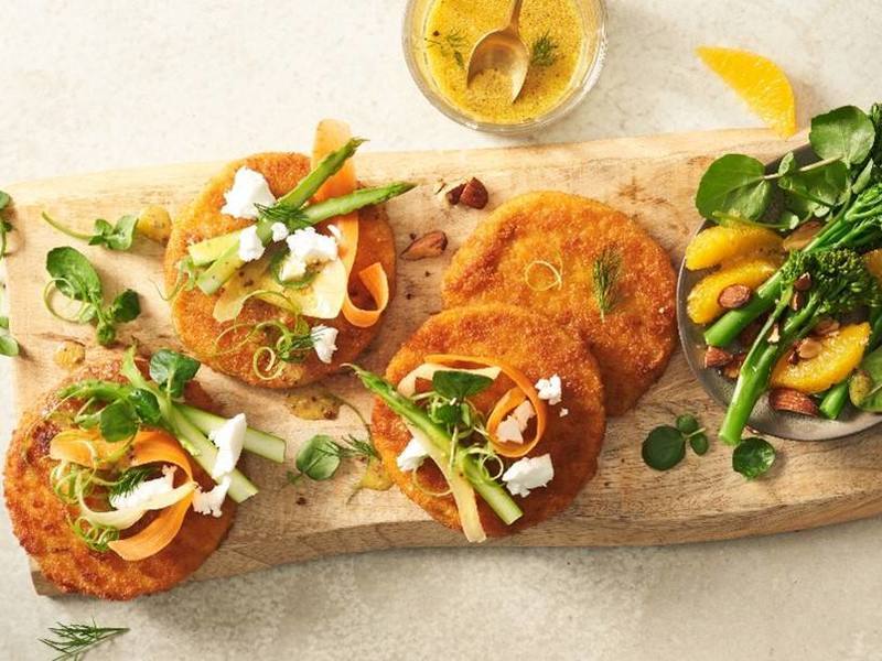 Ετοιμάζουμε τα Crispy Chic Burgers σύμφωνα με τις οδηγίες πάνω στο πακέτο. Βάζουμε πάνω στα burgers τα καρότα, το κρεμμύδι, τα σπαράγγια, την αγριορόκα και τα κομματάκια φέτας. Ετοιμάζουμε μια συνοδευτική σαλάτα με μπροκολίνι, μαρούλι και κομμάτια πορτοκάλι. Πασπαλίζουμε τα burgers με λίγη από τη σάλτσα και την υπόλοιπη τη βάζουμε στη σαλάτα μαζί με τα αμύγδαλα.