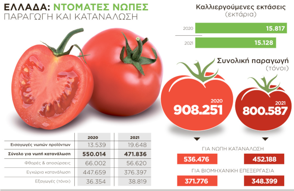 Σχετικά με την εγχώρια παραγωγή επιτραπέζιας ντομάτας, αυτή υπολογίζεται στους 500.000 τόνους, εκ των οποίων μόλις το 1/3 κατευθύνεται στην εγχώρια αγορά και οι υπόλοιπες ποσότητες εξάγονται στις ευρωπαϊκές αγορές. Σύμφωνα με στελέχη της αγοράς, ο οι Ελληνες δεν έχουν λεφτά να ψωνίσουν και περιορίζονται στην αγορά 1-2 ντοματών κάθε φορά. Οπότε αναγκάζονται να τις εξαγάγουν στο εξωτερικό, σε χώρες όπως η Ρουμανία, η Βουλγαρία, η Πολωνία, η Γερμανία, η Τσεχία, η Ουγγαρία κ.λπ.