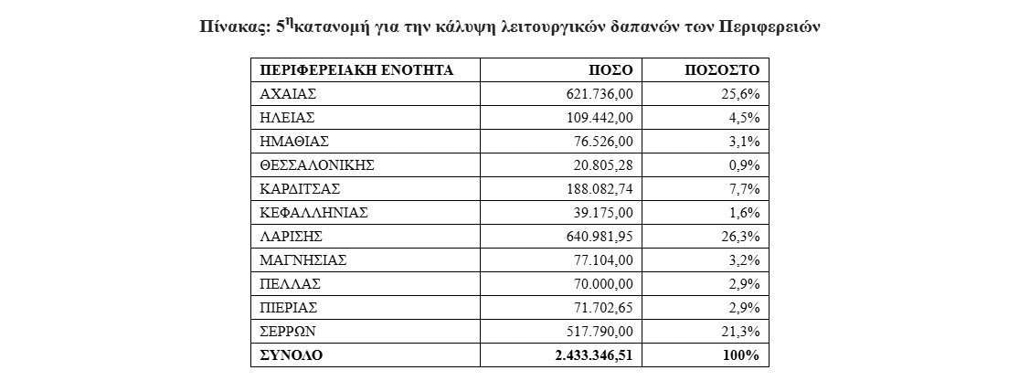 Συγκεκριμένα, με την 5η κατανομή καταβλήθηκαν 2.433.346,51 €, ενισχύοντας σημαντικά τις Περιφερειακές Ενότητες Λάρισας (26,3%), Αχαΐας (25,6%) και Σερρών (21,3%).