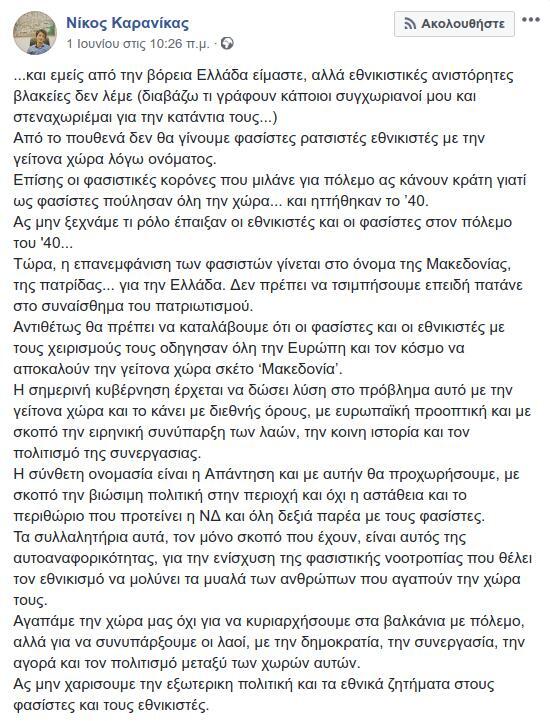 Ο Νίκος Καρανίκας μιλά για τον Β΄ Παγκόσμιο Πόλεμο και για δήθεν διάθεση ορισμένων να κατακτήσουν τα Σκόπια. Όλα αυτά επειδή δεν θέλουν τον όρο «Μακεδονία» στην ονομασία των Σκοπίων. Ο κ. Καρανίκας έχει εκτεθεί πολλές φορές ξεπερνώντας τα όρια ευπρέπειας στον δημόσιο λόγο.