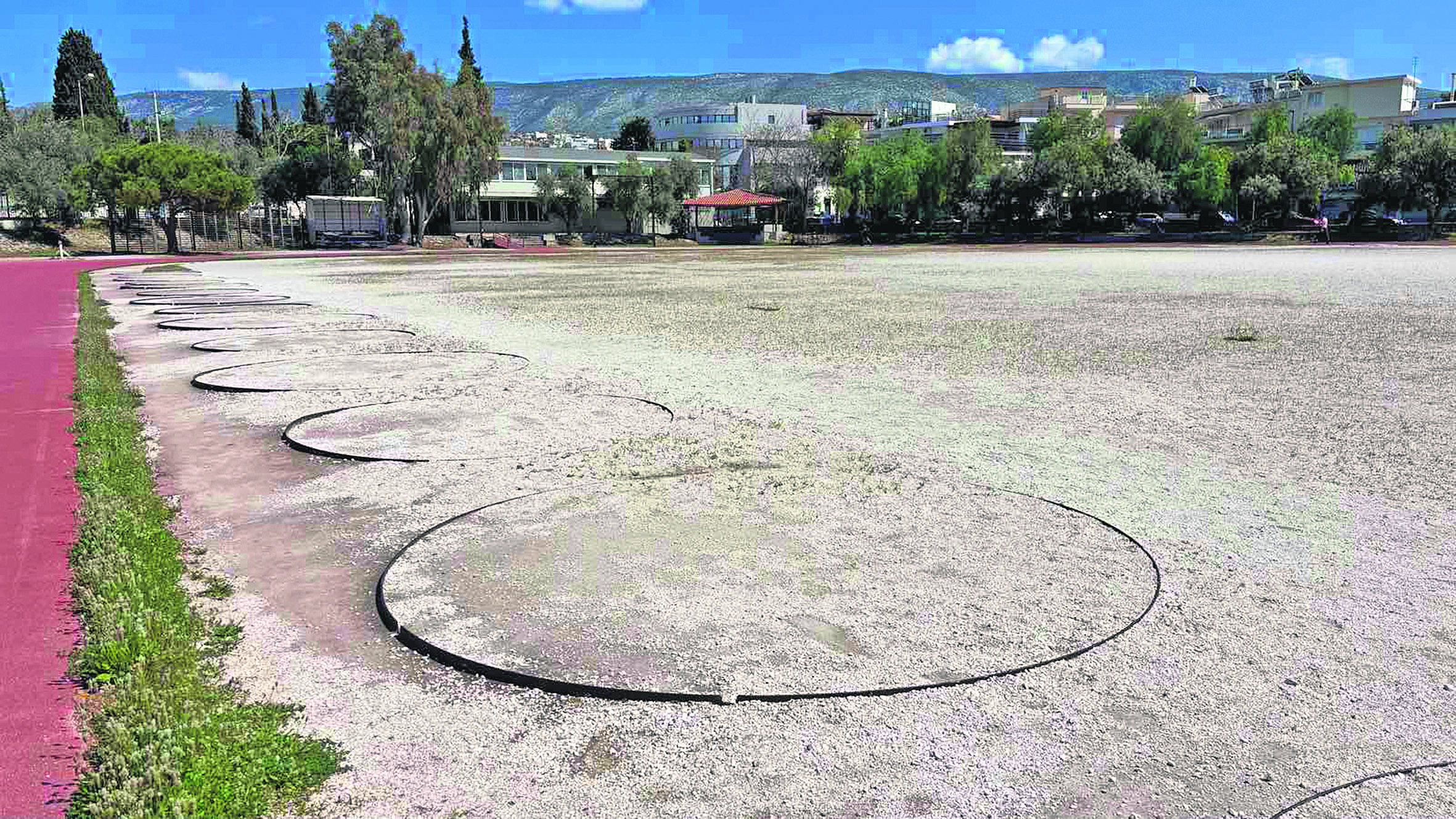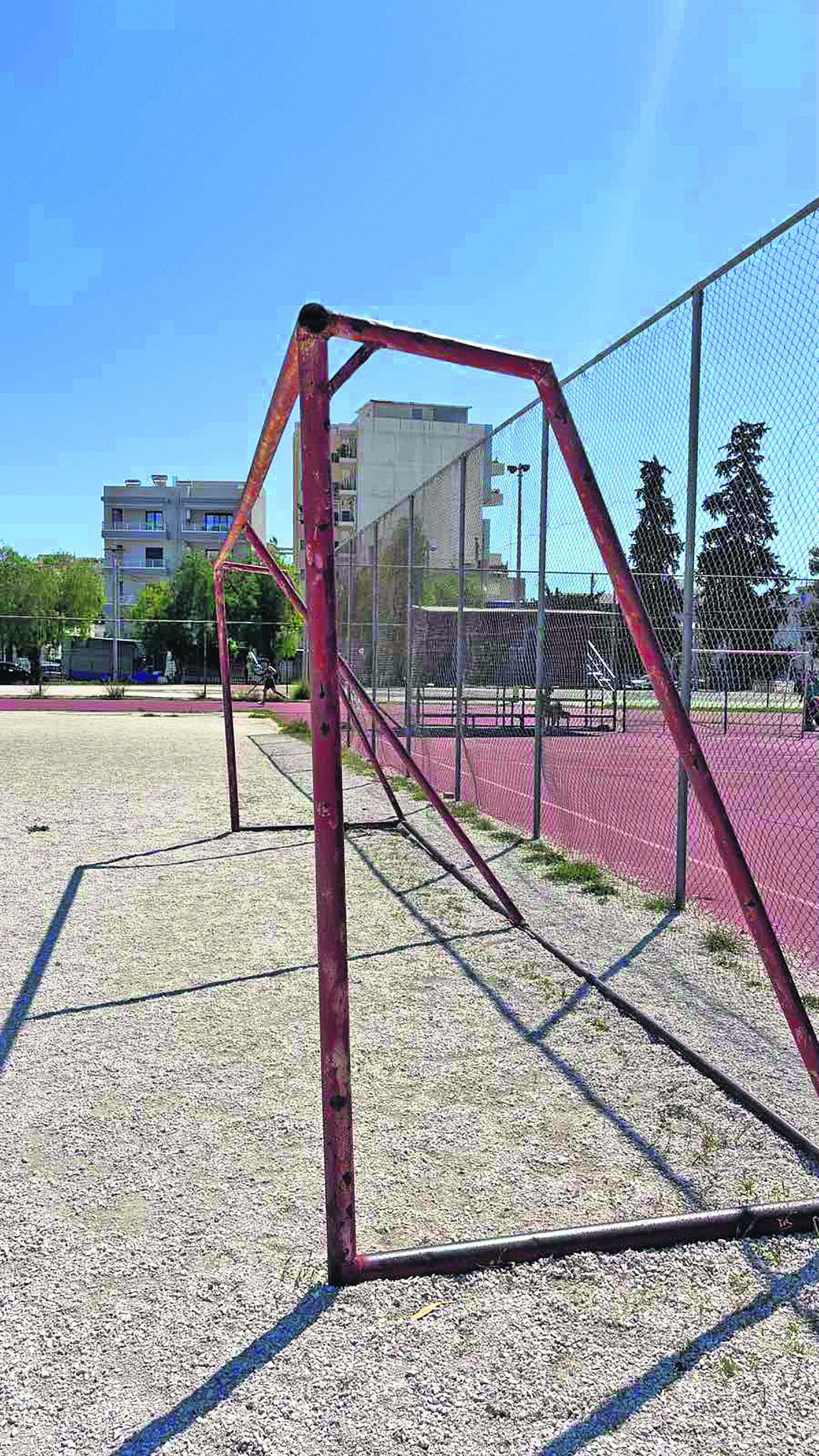 Η αυτοψία ξεκινάει. Δύο παλιά γήπεδα μπάσκετ με φθαρμένο τον αγωνιστικό χώρο και, βέβαια, χωρίς μπασκέτες. Ο στίβος και αυτός εγκαταλελειμμένος. Το ταρτάν δείχνει να έχει να ανακατασκευαστεί πάρα πολλά χρόνια. Μέσα σε ένα γήπεδο με χαλίκι υπάρχει ένα μόνο σκουριασμένο τέρμα ποδοσφαίρου και βαλβίδες -σκεπασμένες με χαλίκι- για το άθλημα της σφαίρας. Στο πλάι ένα γηπεδάκι, που με δυσκολία θα μπορούσε να χρησιμοποιηθεί για 5×5 ποδόσφαιρο ή χάντμπολ. Το ταρτάν στους διαδρόμους για το μήκος και το τριπλούν έχει «σκάσει», ενώ χόρτα έχουν φυτρώσει μέσα στο σκάμμα.