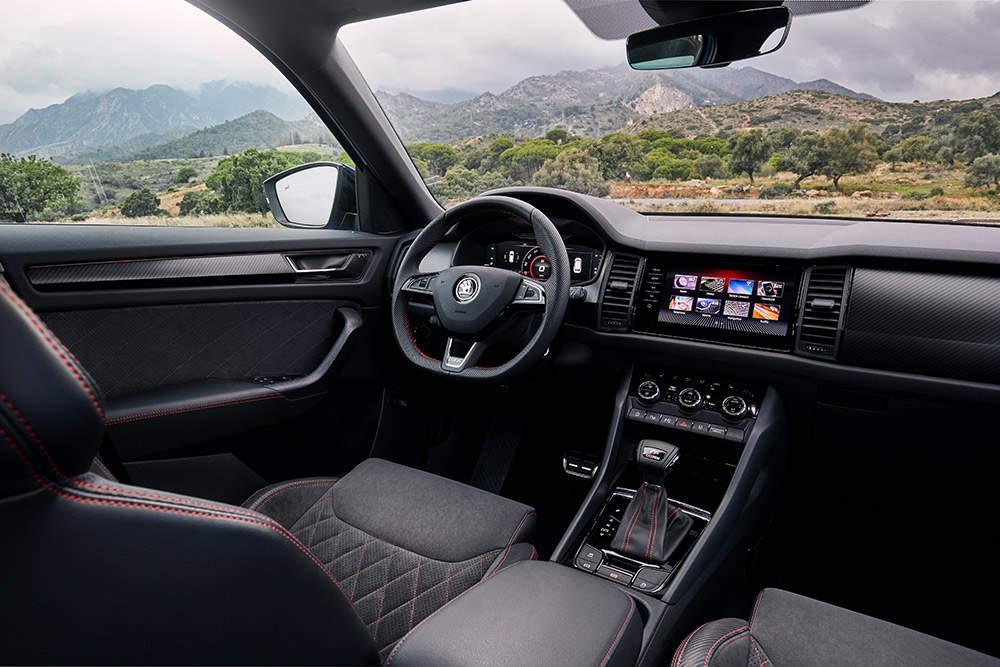 Οι προφυλακτήρες έχουν επανασχεδιαστεί. «φορά» ζάντες 20 ιντσών –πίσω από τις οποίες βλέπουμε δίσκους φρένων 17 ιντσών – και υπάρχουν μαύρες λεπτομέρειες στο εξωτερικό. Στην καμπίνα, δεν υπάρχουν μεγάλες διαφορές από τις υπόλοιπες εκδόσεις του Kodiaq.