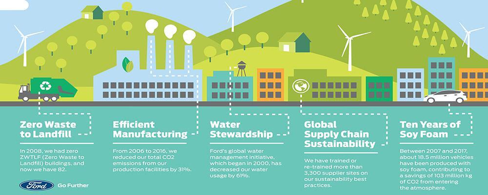 Επιπλέον, το 2017 η Ford πέτυχε το στόχο της να μειώσει σε παγκόσμιο επίπεδο τις εκπομπές διοξειδίου του άνθρακα από τα εργοστάσια παραγωγή της κατά 30%, οκτώ χρόνια νωρίτερα από το χρονικό ορόσημο του 2025.