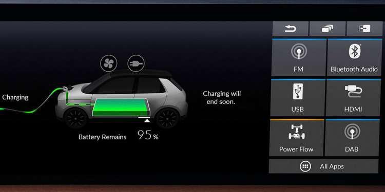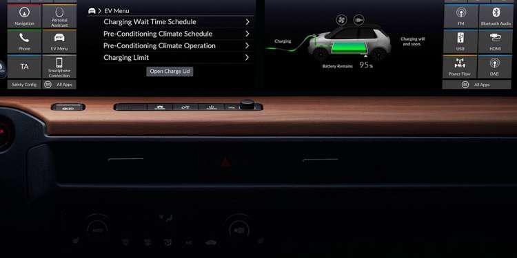 Από την εικόνα καταλαβαίνουμε ότι οι οθόνη θα περιλαμβάνει πολλές διαφορετικές λειτουργίες. Θα δείχνει τον υπολειπόμενο χρόνο για την πλήρη φόρτιση, θα έχει -φυσικά- το ρόλο του infotainment, διαθέτοντας πλοήγηση και τις ρυθμίσεις της πηγής του ήχου, ενώ παρατηρούμε και λίγα κουμπιά, ένα ως «home button», ένα άλλο για την ρύθμιση της έντασης. Χαμηλότερα στο ταμπλό βλέπουμε την κλασσική διαμόρφωση χειριστηρίων για τον κλιματισμό.