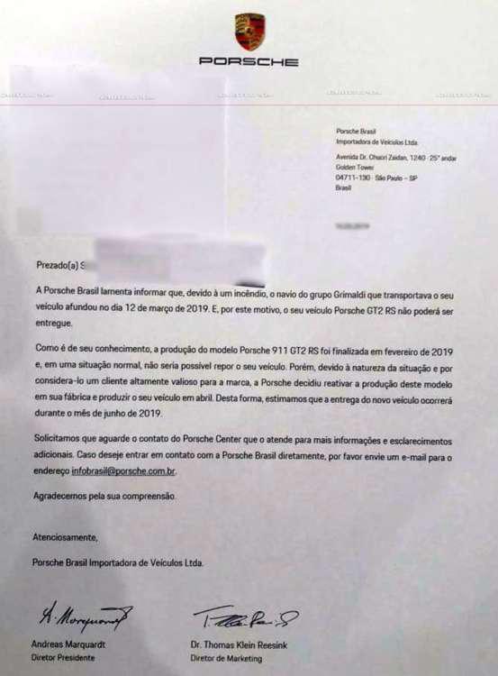«Με λύπη σας ενημερώνουμε, ότι λόγω πυρκαγιάς σε πλοίο του ομίλου Grimaldi που μετέφερε το όχημα σας και βύθισης του στις 12 Μαρτίου 2019, η GT2 RS δεν θα μπορέσει να παραδοθεί.