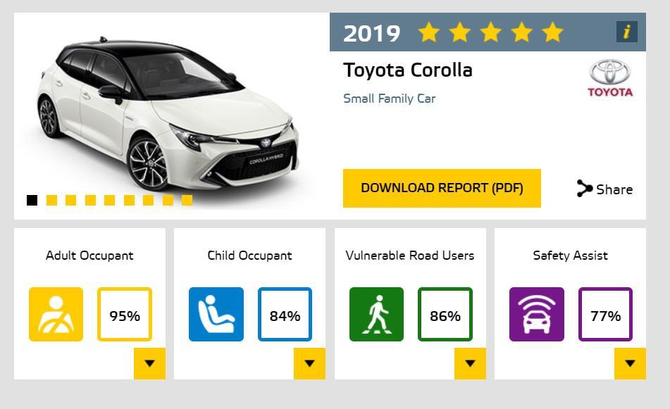 Το νέο Toyota Corolla απέσπασε επίσης βαθμολογία 5 αστέρων, με την βαθμολογία για τους ενήλικους και ανήλικους επιβάτες να είναι 95% και 84% αντίστοιχα. Για τους πεζούς και τα συστήματα ασφαλείας, οι βαθμολογίες ήταν 86% και 77%.
