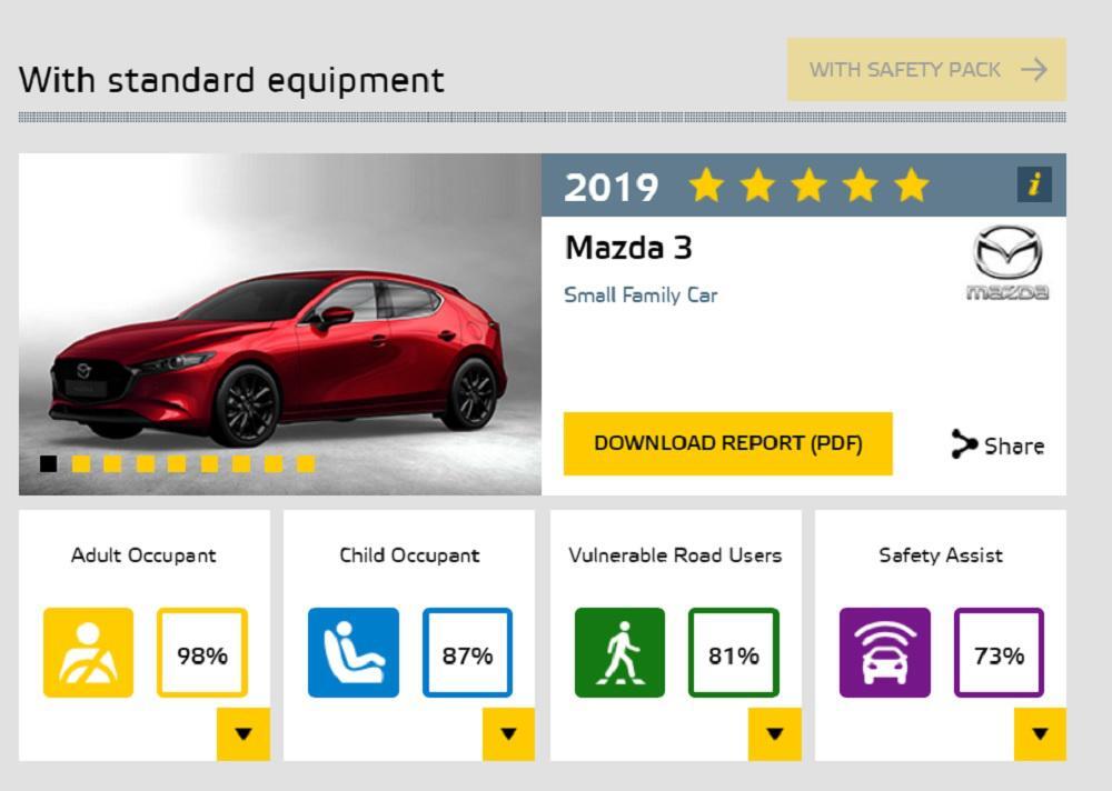 Το Mazda 3, το μικρό οικογενειακό της εταιρείας, πήρε βαθμολογία 98% για την ασφάλεια ενήλικων επιβατών και 87% για την ασφάλεια ανήλικων.