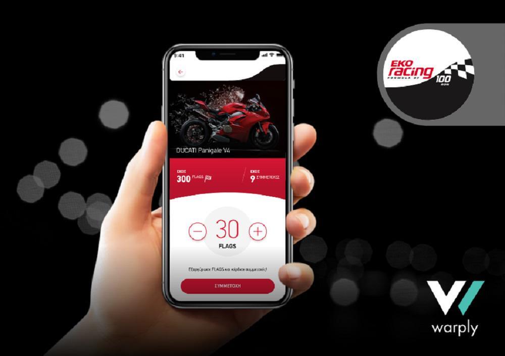 Η ενέργεια EKO Racing 100 βασίζεται σε έναν Οmnichannel καινοτόμο διαγωνισμό όπου οι χρήστες έχουν τη δυνατότητα να ανεβάσουν την φωτογραφία της απόδειξης τους με αγορά καυσίμου EKO Racing 100 και να λάβουν αυτόματα FLAGS (πόντους επιβράβευσης) αντίστοιχα με το ποσό της αγοράς τους, που εξαργυρώνουν σε συμμετοχές για δώρα της επιλογής τους, με μεγάλο δώρο μια μοτοσυκλέτα Ducati Panigale V4.