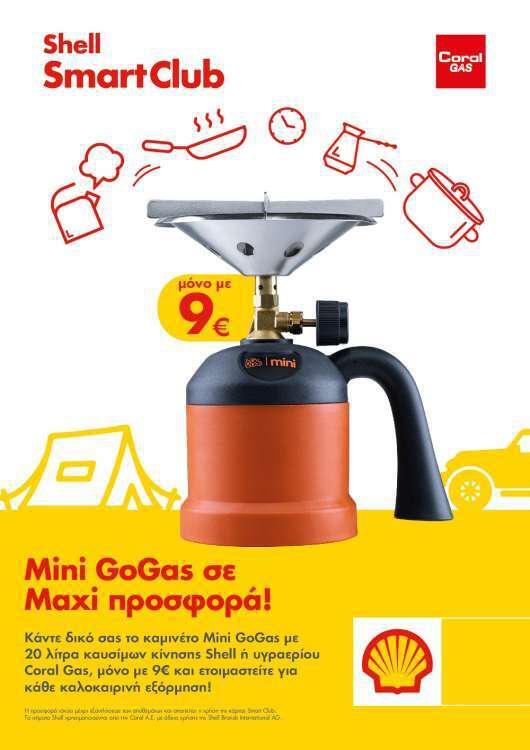 Συγκεκριμένα, κάθε φορά που οι καταναλωτές ανεφοδιάζουν το όχημά τους με τουλάχιστον 20 λίτρα από τα αγαπημένα καύσιμα κίνησης Shell ή υγραερίου Coral Gas έχουν τη δυνατότητα να κάνουν δικό τους το καμινέτο Mini GoGas με επιπλέον χρέωση μόλις 9€.