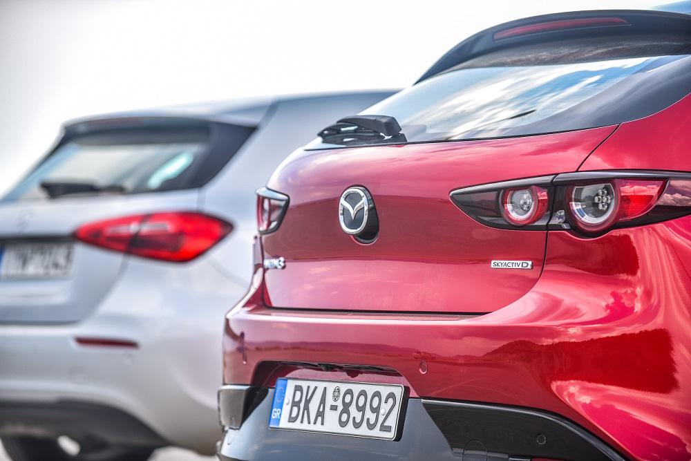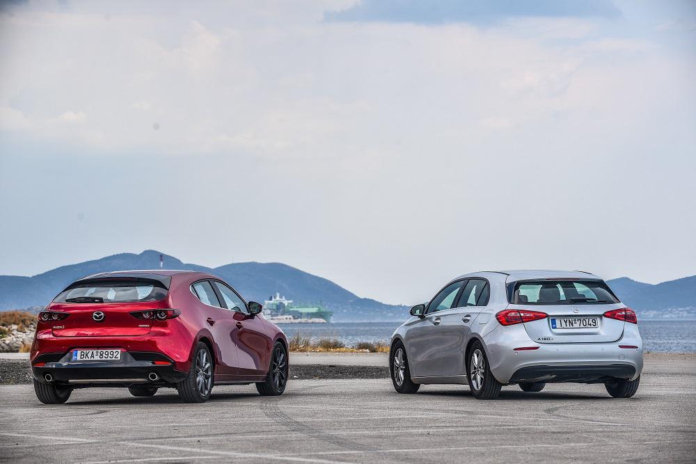 Οδηγικά, το Mazda 3 θα σε βάλει στο παιχνίδι πιο πολύ απ’ ότι η συγκεκριμένη A-Class. Έχει τιμόνι με καλή αίσθηση και πληροφόρηση (αν και λίγο πιο ελαφρύ απ’ ότι θα ήθελες), κορυφαίο χειροκίνητο κιβώτιο 6 σχέσεων και εξαιρετική ποιότητα κύλισης. Πράγματι, η δουλειά που έχει γίνει σε επίπεδο ηχομόνωσης τόσο από τον θόρυβο του αέρα όσο και από τον δρόμο, είναι κορυφαία. Ναι, το Mazda 3 είναι ένα ευχάριστο αυτοκίνητο να οδηγείς, όμως σε αυτή την περίπτωση, θέλεις και το κάτι παραπάνω από τον κινητήρα. Δεν το έχεις. Και το χειρότερο; Δεν μπορείς και να το αποκτήσεις, γιατί απλά δεν υπάρχει. Το μόνο που μπορείς να κάνεις, είναι να πας στον δίλιτρο ατμοσφαιρικό βενζίνης με 122 ίππους. Μπρος γκρεμός και πίσω ρέμα δηλαδή. Με την A-Class, γνωρίζεις πως η Α180d, είναι το πιο προσιτό διαβατήριο για την είσοδο στο club των premium. Αν θέλεις περισσότερα και το πορτοφόλι σου αντέχει, τότε ισχύει το sky is the limit.