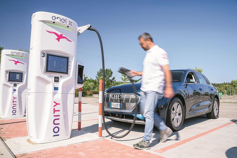Μετά από την πρώτη διανυκτέρευση στα νότια της Ρώμης κοντά σε έναν ταχυφορτιστή, στο στόχαστρο βάζω πλέον ένα συγκεκριμένο σταθμό φόρτισης στην πόλη Βαλντικιάνα της Τοσκάνης, ανάμεσα στο Μοντεπουλτσιάνο και το Αρέτσο, όπου βρίσκεται ο μοναδικός σήμερα στην Ιταλία ταχυφορτιστής Ionity, ο οποίος θα μου δώσει μία γεύση από όσα θα ζήσουμε στο μέλλον. Υπό κατασκευή βρίσκονται άλλοι δύο Ionity στο Κάρπι και στο Πορτογκρουάρο. Φτάνω στο πάρκινγκ και τέσσερις κολώνες φόρτισης εμφανίζονται μπροστά μου. Περνάω την κάρτα στο μηχάνημα, συνδέω το καλώδιο CCS του e-Tron και μένω με το στόμα ανοιχτό μπροστά στην ψηφιακή οθόνη με το θαύμα που συντελείται. Με παροχή ρεύματος 150 kW την ώρα η μπαταρία του Audi γεμίζει σε λιγότερο από μισή ώρα.