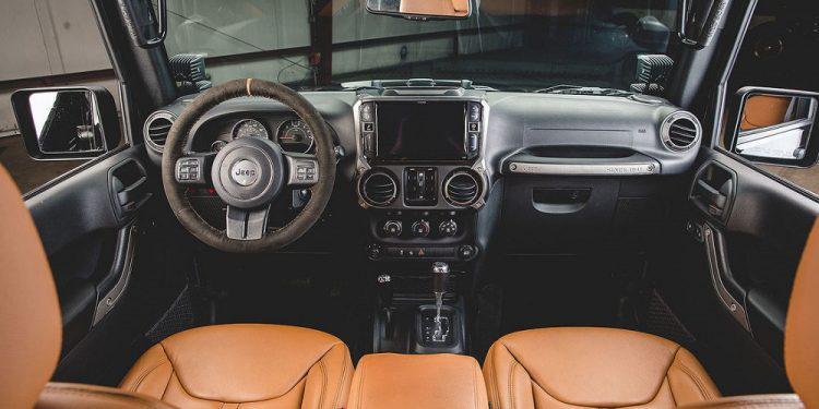 Πάντως, το εξατομικευμένο Wrangler απέχει μακράν από το αυτοκίνητο παραγωγής και στο εσωτερικό του. Τα καθίσματα είναι πλέον σε στιλ… Ferrari Daytona, ψηλά έχουν τοποθετηθεί νέες χειρολαβές και για την ψυχαγωγία του πληρώματος αυτό το Jeep έχει εφοδιαστεί με ηχοσύστημα, που συνοδεύεται από ηχεία της Alpine και ενισχυτή της Rockford Fosgate!