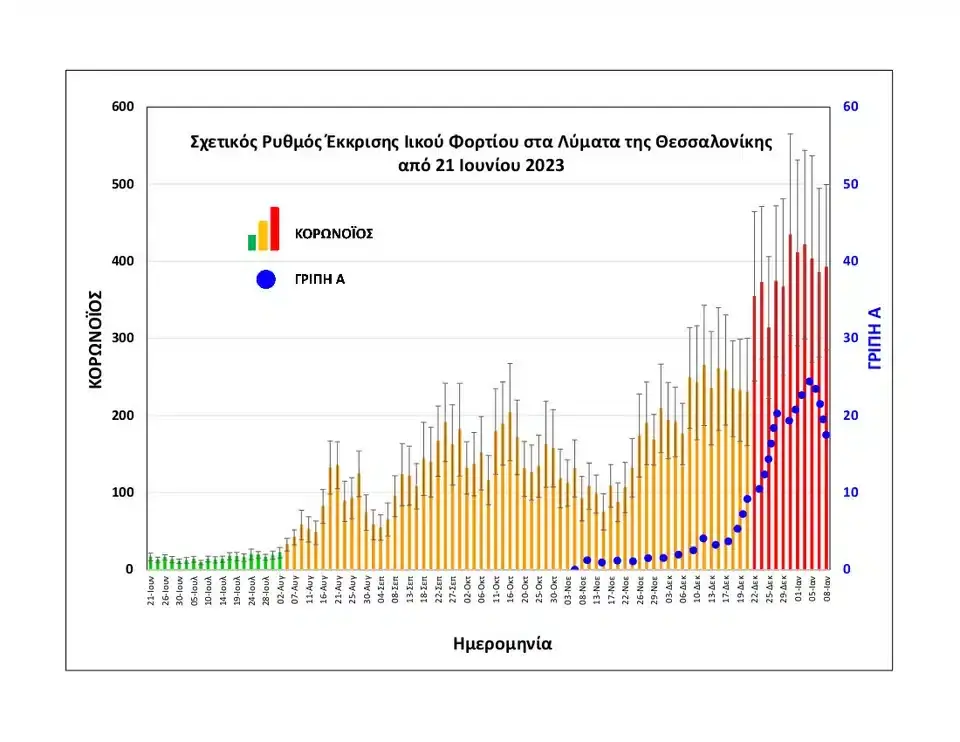 «Καθ’ όλο το διάστημα του Δεκεμβρίου εντοπίσαμε σημαντική αύξηση του Sars-CoV-2 αλλά και της γρίπης Α στα λύματα της πόλης, η οποία και για τους δύο ιούς κορυφώθηκε τρεις ημέρες μετά την Πρωτοχρονιά. Το ιικό φορτίο της γρίπης Α προσδιορίσθηκε με νέα αξιόπιστη και ευαίσθητη μοριακή τεχνική που αναπτύχθηκε από την ομάδα μας. Ενδιαφέρον παρουσιάζει ο μεγαλύτερος ρυθμός αύξησης της γρίπης Α, με διπλασιασμό του ιικού φορτίου ανά 7 ημέρες. Όμως, σε απόλυτες τιμές, το ιικό φορτίο της ήταν περίπου 20 φορές μικρότερο από αυτό του Sars-CoV-2 κατά την περίοδο της κοινής κορύφωσης» διευκρίνισε ο καθηγητής Μοριακής Μικροβιολογίας του Τμήματος Κτηνιατρικής ΑΠΘ Χρυσόστομος Δόβας.