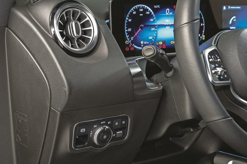 Όποιος δεν έχει οδηγήσει στη ζωή του Mercedes, θα πρέπει να εξοικειωθεί και με τον επιλογέα του κιβωτίου που εξακολουθεί να βρίσκεται στη δεξιά πλευρά του λαιμού του τιμονιού, εκεί όπου συνήθως βρίσκεται ο διακόπτης των υαλοκαθαριστήρων. Ο οποίος εδώ βρίσκεται στα αριστερά και περιλαμβάνει τον έλεγχο των φλας. Αυτή η εργονομία Mercedes από χρόνια αποσυντονίζει τους οδηγούς όλου του κόσμου. Όμως όλα είναι θέμα συνήθειας τελικά.