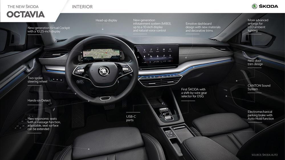 Εξίσου καινούργια είναι και η προσέγγιση του εσωτερικού σχεδιασμού της OCTAVIA: άμεση είναι η αίσθηση για τα κορυφαίας ποιότητας υλικά ενώ για πρώτη φορά σε μοντέλο παραγωγής της SKODA, η νέα γενιά του best seller της διαθέτει μια ελεύθερη κεντρική οθόνη που συμπληρώνεται από ένα νέο πίνακα οργάνων πολλαπλών επιπέδων και μια τολμηρή σχεδιαστικά κεντρική κονσόλα. Το επανασχεδιασμένο τιμόνι με τις δύο ακτίνες διαθέτει μια ακόμα πιο έξυπνη διάταξη χειριστηρίων και καινοτόμους περιστροφικούς επιλογείς, για καλύτερη εργονομία και ευκολία χρήσης.