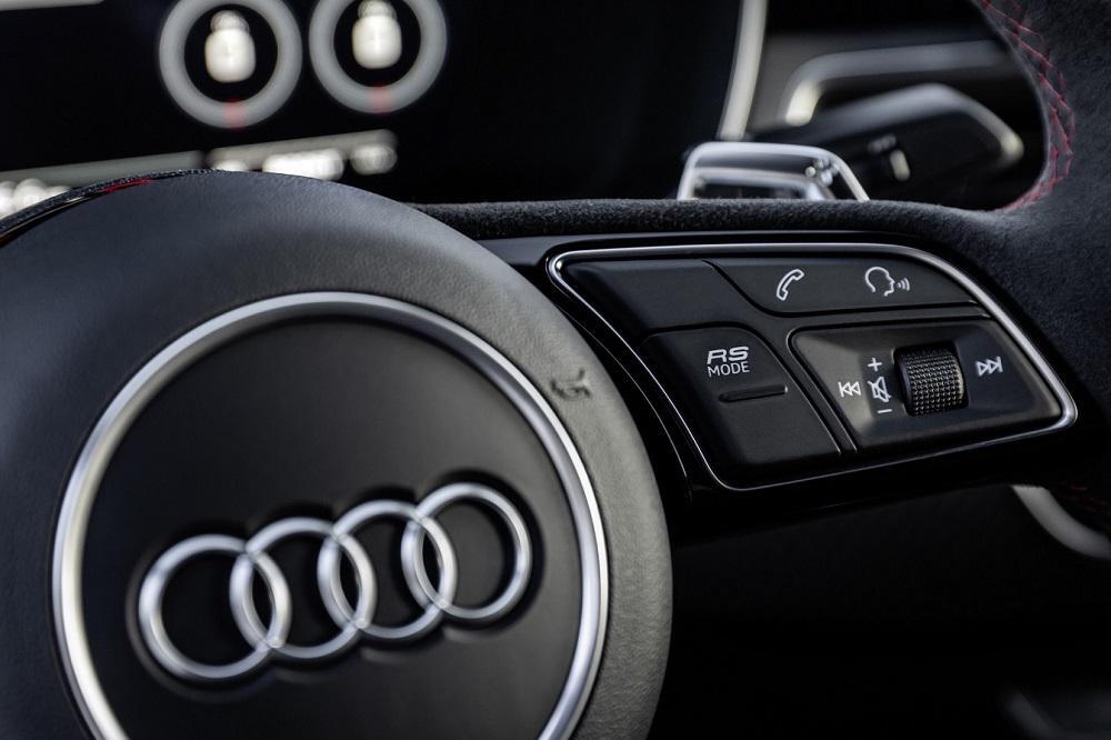 Επιπλέον, εμφανίζονται η επιτάχυνση και οι χρόνοι γύρου σε πίστα. Το πεπλατυσμένο δερμάτινο τιμόνι RS, πλήρως διάτρητο, με νέα paddles αλουμινίου, διαθέτει επίσης το κουμπί “RS MODE”, που χρησιμοποιεί ο οδηγός για να επιλέξει mode λειτουργίας “RS1” ή “RS2” και το οποίο ανοίγει αυτόματα τις ειδικές οθόνες RS στο Audi virtual cockpit. Διαθέσιμο προαιρετικά και head-up display, για την εμφάνιση πολλών λειτουργιών στο παρμπρίζ του αυτοκινήτου.
