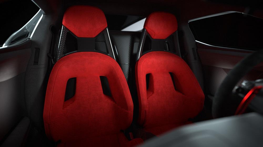 Το απέριττο οδηγοκεντρικό εσωτερικό φέρει μοναδικό εξοπλισμό, όπως μαύρη επένδυση από Alcantara suede στο ταμπλό, την οροφή και το τιμόνι, ενώ τα κόκκινα paddles του κιβωτίου και τα κόκκινα σπορ καθίσματα από Alcantara προσδίδουν μοναδικές αντιθέσεις.