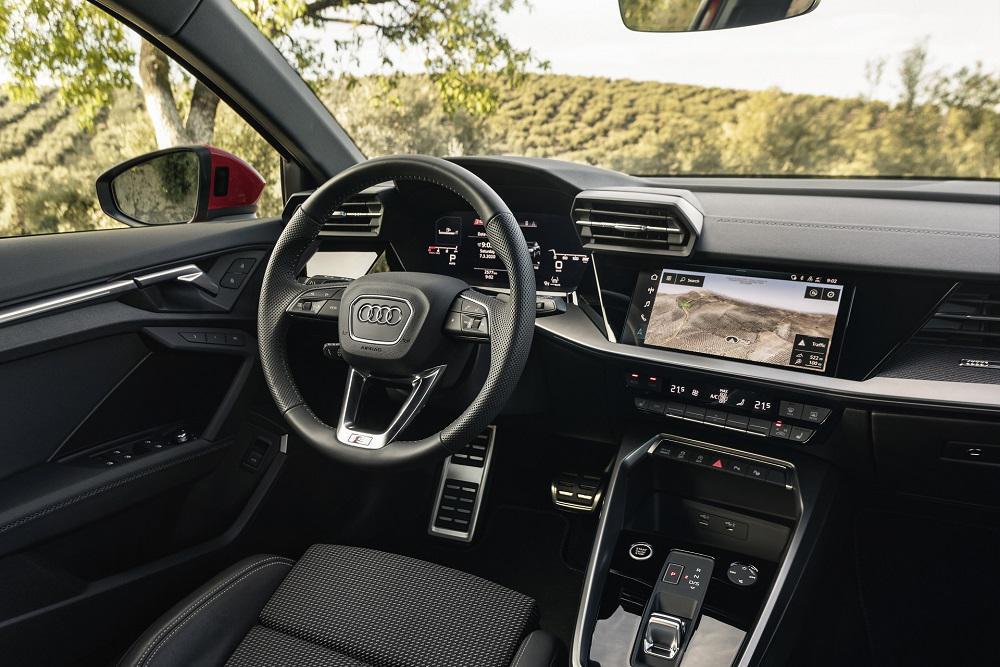 Η όψη black-panel του πίνακα οργάνων και της κεντρικής κονσόλας, οι κομψές ραφές σε χρώματα αντίθεσης, οι εντυπωσιακές θυρολαβές και ο νέος σχεδιασμός του μοχλού αλλαγής ταχυτήτων – το εσωτερικό του A3 Sportback δείχνει και είναι σπορ και υψηλής ποιότητας. Οι ακριβείς οριζόντιες γραμμές και οι επιφάνειες με σαφή σχεδιασμό τονίζουν το πλάτος του cockpit. Αυτό επιτυγχάνεται επίσης με την εντυπωσιακή λωρίδα εξαερισμού στην πόρτα στην πλευρά του συνοδηγού και την καμπύλη λωρίδα επένδυσης ακριβώς από κάτω.
