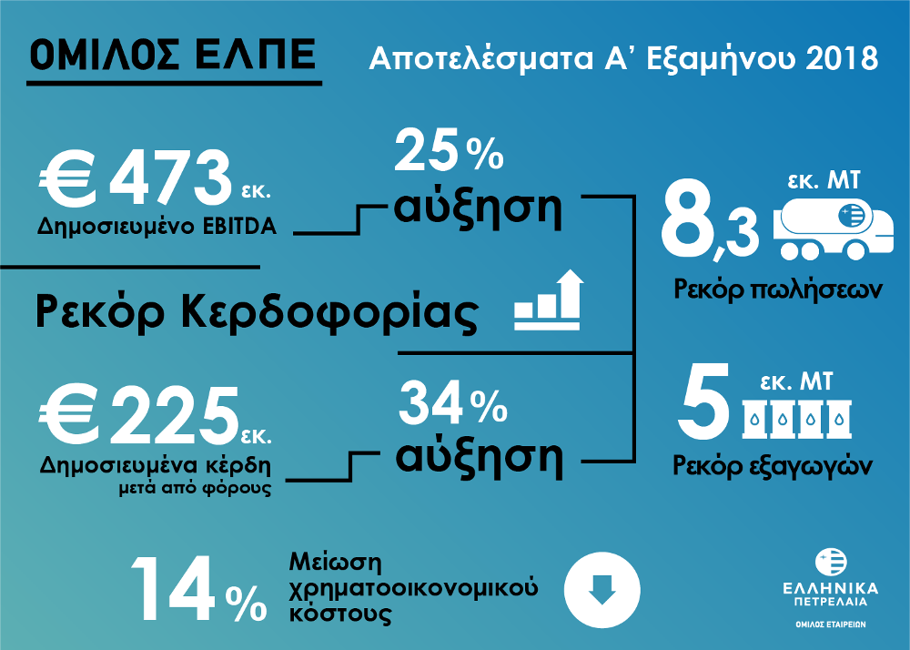 Τα Δημοσιευμένα Κέρδη EBITDA κατά ΔΠΧΠ ανήλθαν στα €307 εκατ. στο Β’ Τρίμηνο 2018 έναντι €152 εκατ. την αντίστοιχη περσινή περίοδο, οδηγώντας τα αντίστοιχα για το Α’ Εξάμηνο στα €473 εκατ. (+25%), ενώ τα Δημοσιευμένα Καθαρά Κέρδη ανήλθαν στα €151 εκατ. για το Β’ Τρίμηνο (έναντι €44 εκατ. πέρυσι) και €225 εκατ. (+34%) στο Α’ Εξάμηνο. Ο κύκλος εργασιών για το τρίμηνο ανήλθε σε €2.5 δισ. ενώ για το εξάμηνο σε €4.7 δισ., καθώς αντανακλά τις αυξημένες τιμές και τους υψηλούς όγκους πωλήσεων.