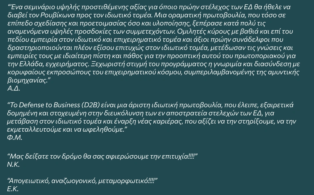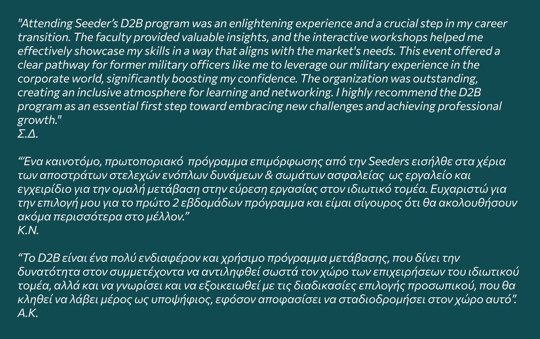 Συγχαρητήρια σε όλους τους απόστρατους που πήραν μέρος! Οι ιστορίες επιτυχίας τους αποδεικνύουν ότι η μετάβαση στη νέα επαγγελματική ζωή μπορεί να είναι γεμάτη ευκαιρίες και προοπτικές.