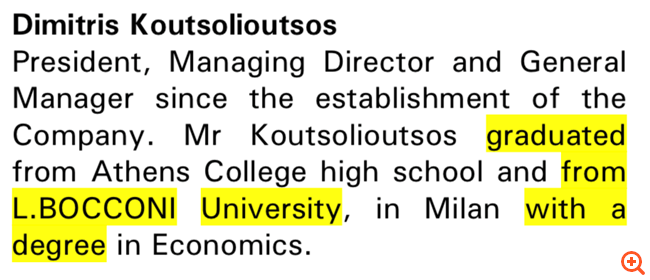 “Σπούδασε Οικονομικές Επιστήμες στο πανεπιστήμιο του Μιλάνου L. BOCCONI” διαβάζουμε στα συνοπτικά βιογραφικά στοιχεία του κ. Δημήτρη Κουτσολιούτσου στον ετήσιο απολογισμό χρήσης 2010 της FF Group. H ίδια διατύπωση συνεχίζεται έως και την τελευταία οικονομική έκθεση του 2017.