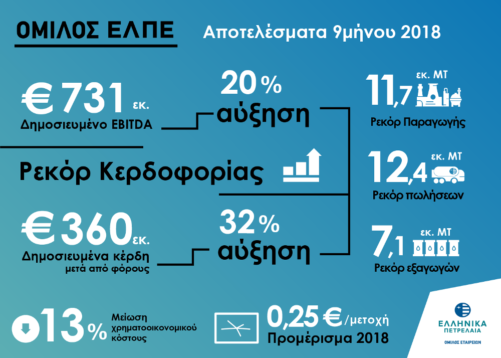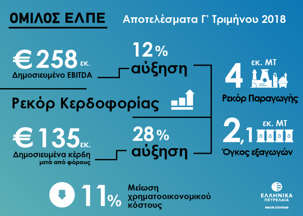 Το Γ΄ τρίμηνο του 2018 ο Όμιλος ΕΛΠΕ σημείωσε ιδιαίτερα ισχυρές επιδόσεις επιβεβαιώνοντας την ηγετική του θέση στον κλάδο της ενέργειας στη Νοτιοανατολική Ευρώπη. Σε αυτές συνέβαλε η αύξηση της παραγωγής των διυλιστηρίων κατά 19% σε σχέση με το Γ’ τρίμηνο 2017, που επέτρεψε την αύξηση των πωλήσεων κατά 8% και των εξαγωγών κατά 27%. Τα παραπάνω αντιστάθμισαν την επίπτωση από την υποχώρηση των περιθωρίων διύλισης κατά 20% και το κόστος για δικαιώματα ρύπων CO2.