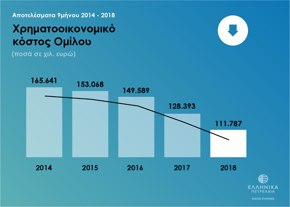 Η χρηματοοικονομική θέση του Ομίλου συνέχισε να βελτιώνεται, με το χρηματοοικονομικό κόστος να καταγράφει νέα μείωση κατά 13% στο εννεάμηνο και 11% στο Γ’ Τρίμηνο, σαν αποτέλεσμα και της ολοκλήρωσης του προγράμματος αναχρηματοδότησης για το 2018.