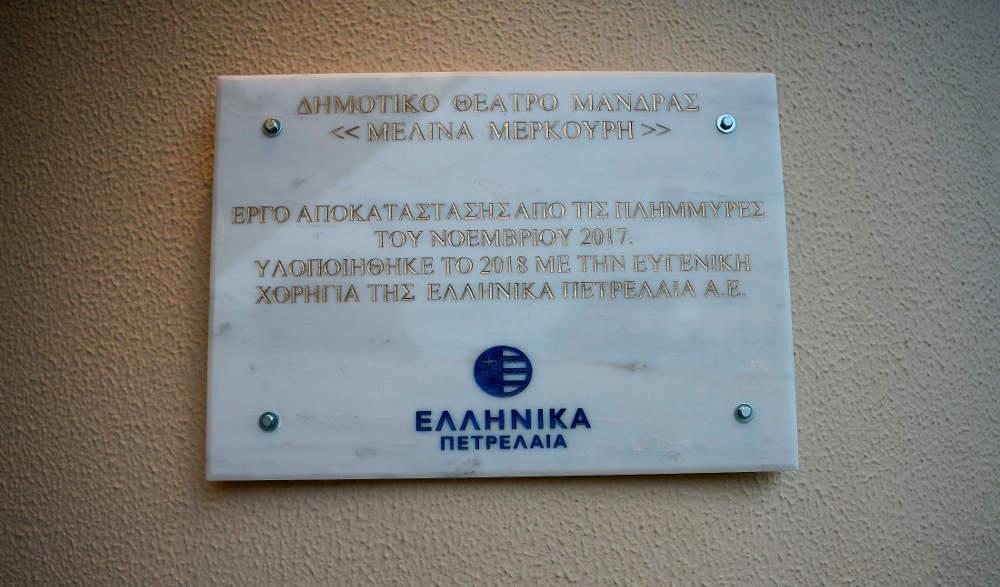 Από την πλευρά της, η Δ/ντρια ΕΚΕ Ομίλου ΕΛΠΕ κα Ράνια Σουλάκη δήλωσε: «Ο Όμιλος ΕΛΛΗΝΙΚΑ ΠΕΤΡΕΛΑΙΑ βρέθηκε από την πρώτη στιγμή στο πλευρό των πληγέντων από της καταστροφικές πλημμύρες στη Μάνδρα, προσφέροντας καύσιμα, γεύματα στους κατοίκους και είδη πρώτης ανάγκης. Ταυτόχρονα, ζητήθηκε από το Δήμο να συμβάλλει στην αποκατάσταση του Δημοτικού Θεάτρου ΜΕΛΙΝΑ ΜΕΡΚΟΥΡΗ, το οποίο καταστράφηκε σχεδόν ολοσχερώς το Νοέμβριο του 2017.