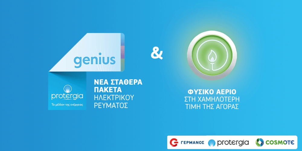 Ιδιώτες και επαγγελματίες θα βρουν στο δίκτυο καταστημάτων του Ομίλου ΟΤΕ ολοκληρωμένες λύσεις ενέργειας από την Protergia για το σπίτι και την επιχείρησή τους. Μεταξύ άλλων, για οικιακούς πελάτες διατίθενται τα νέα σταθερά πακέτα ηλεκτρικού ρεύματος Genius από 26€ /μήνα τα οποία μπορούν να συνδυαστούν με φυσικό αέριο, στη χαμηλότερη τιμή φυσικού αερίου της αγοράς.