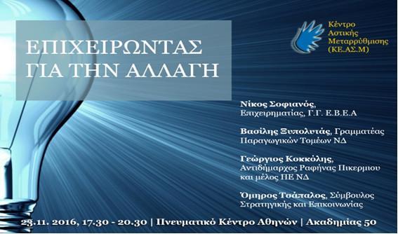Με αφορμή τα παραπάνω, το ΚΕ.ΑΣ.Μ. παίρνει την πρωτοβουλία για την οργάνωση μίας εκδήλωσης στο πνευματικό κέντρο του Δήμου Αθηναίων , φιλοδοξώντας να δώσει ρεαλιστικές προτάσεις για την επίλυση καίριων προβλημάτων, προκειμένου να οδηγηθεί η οικονομία μας και πάλι σε ανοδική πορεία.
