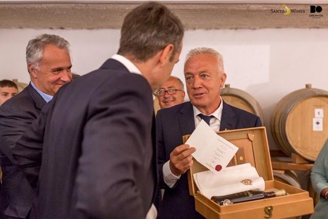 Μετά το τέλος της συνέντευξης τύπου, ο κύριος Καφούρος ξενάγησε τον Πρωθυπουργό στις εγκαταστάσεις του οινοποιείου και του Κέντρου Οινοτουρισμού SantoWines. Στο κελάρι γεύτηκαν Santorini Grande Reserve που ωρίμαζε ακόμα στο βαρέλι, ενώ ως ενθύμιο του πρόσφερε μία από τις 600 συλλεκτικές φιάλες Vinsanto εσοδείας 1993.
