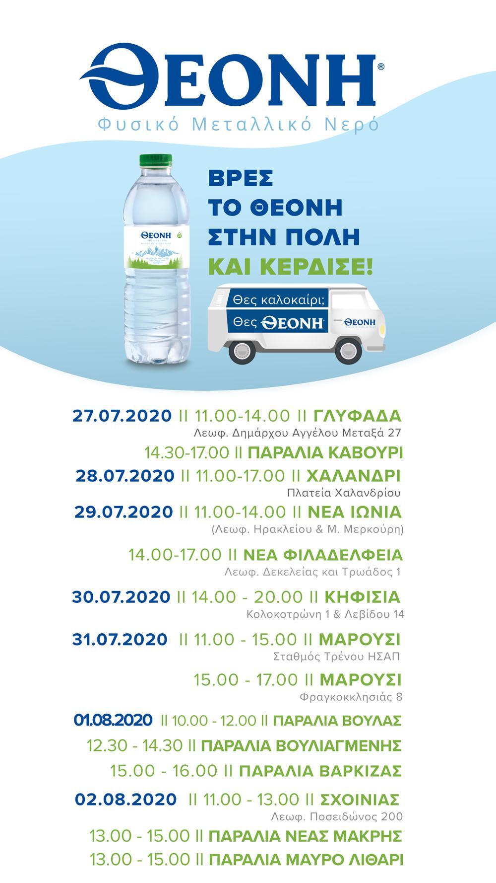 Το ΘΕΟΝΗ van γεμίζει τις αποσκευές του με το μοναδικό ελληνικό νερό με 23 Διεθνή Βραβεία Ποιότητας και ξεκινάει τη διαδρομή του διασχίζοντας τα πιο κομβικά σημεία της, με τελικό προορισμό… την καλοκαιρινή σου ενυδάτωση! Σημείωσε τους σταθμούς*, επισκέψου το πλησιέστερο spot που σε εξυπηρετεί, ανέβασε τη φωτογραφία σου από το ΘΕΟΝΗ van στο Instagram κάνοντας tag το @theoninaturalmineralwater και προσθέτοντας το hashtag #iLoveTHEONI και πάρε μέρος στον πιο καλοκαιρινό διαγωνισμό!