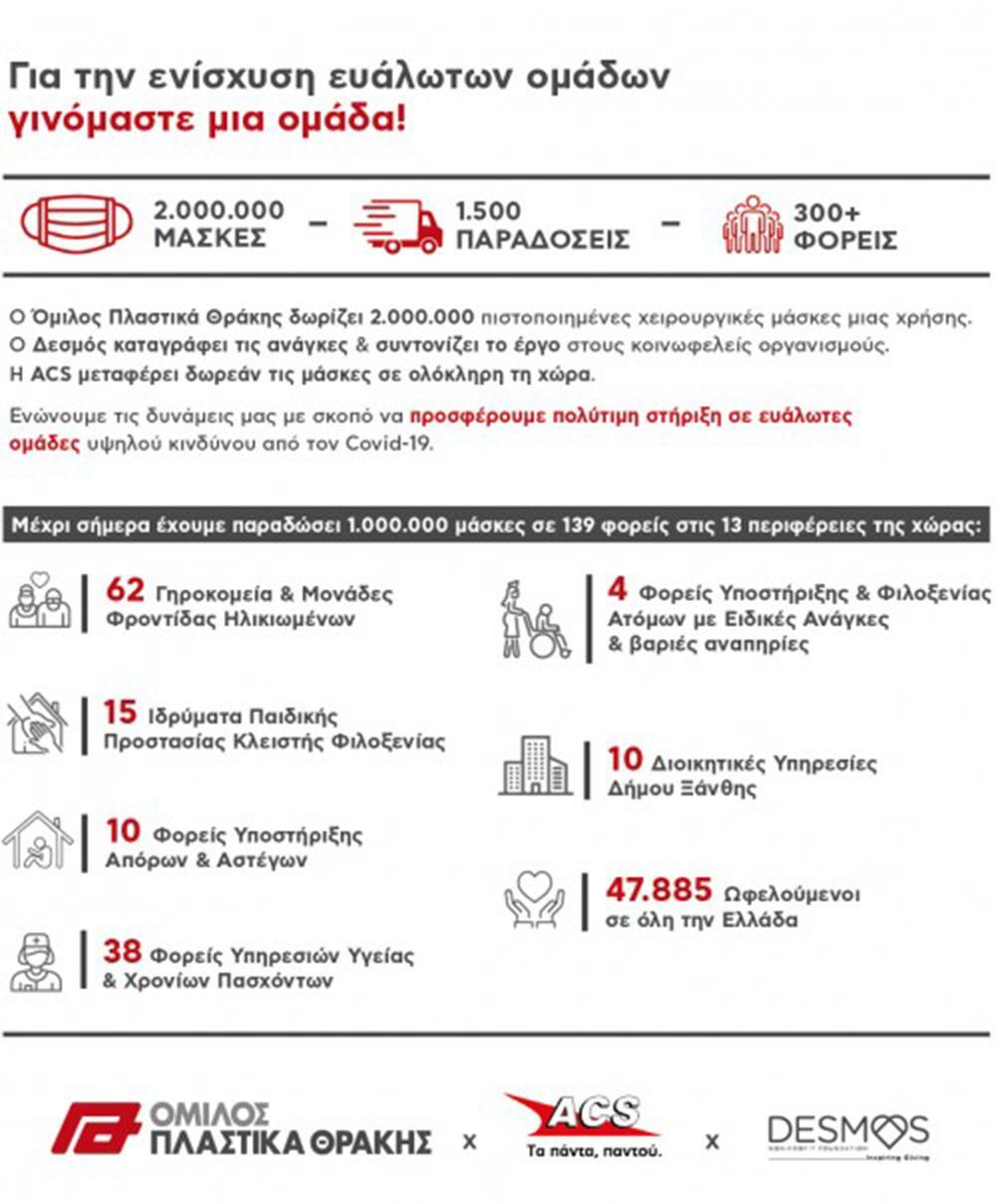 Από την 1η Ιουνίου, η ACS Ταχυδρομικές Υπηρεσίες έχει παραδώσει δωρεάν και με ασφάλεια 1.000.000 μάσκες σε κοινωφελείς οργανισμούς σε ολόκληρη τη χώρα. Από αυτές, 212.000 έχουν διανεμηθεί από το Κοινωνικό Κέντρο «Σταύρος Χαλιορής» στην περιοχή της Θράκης.