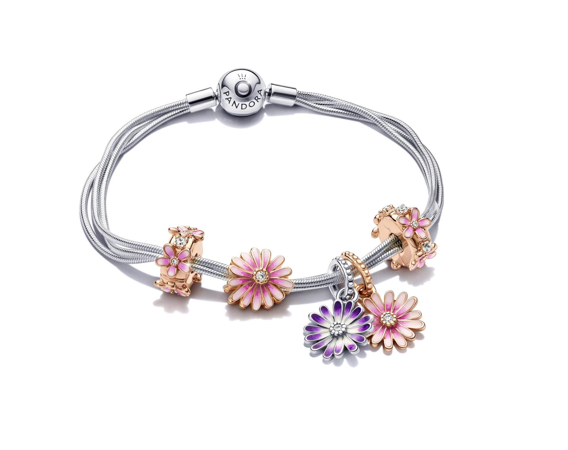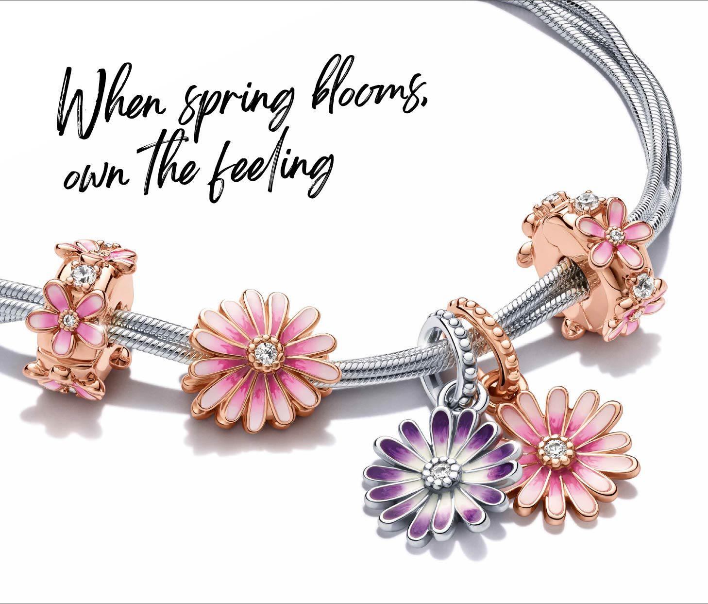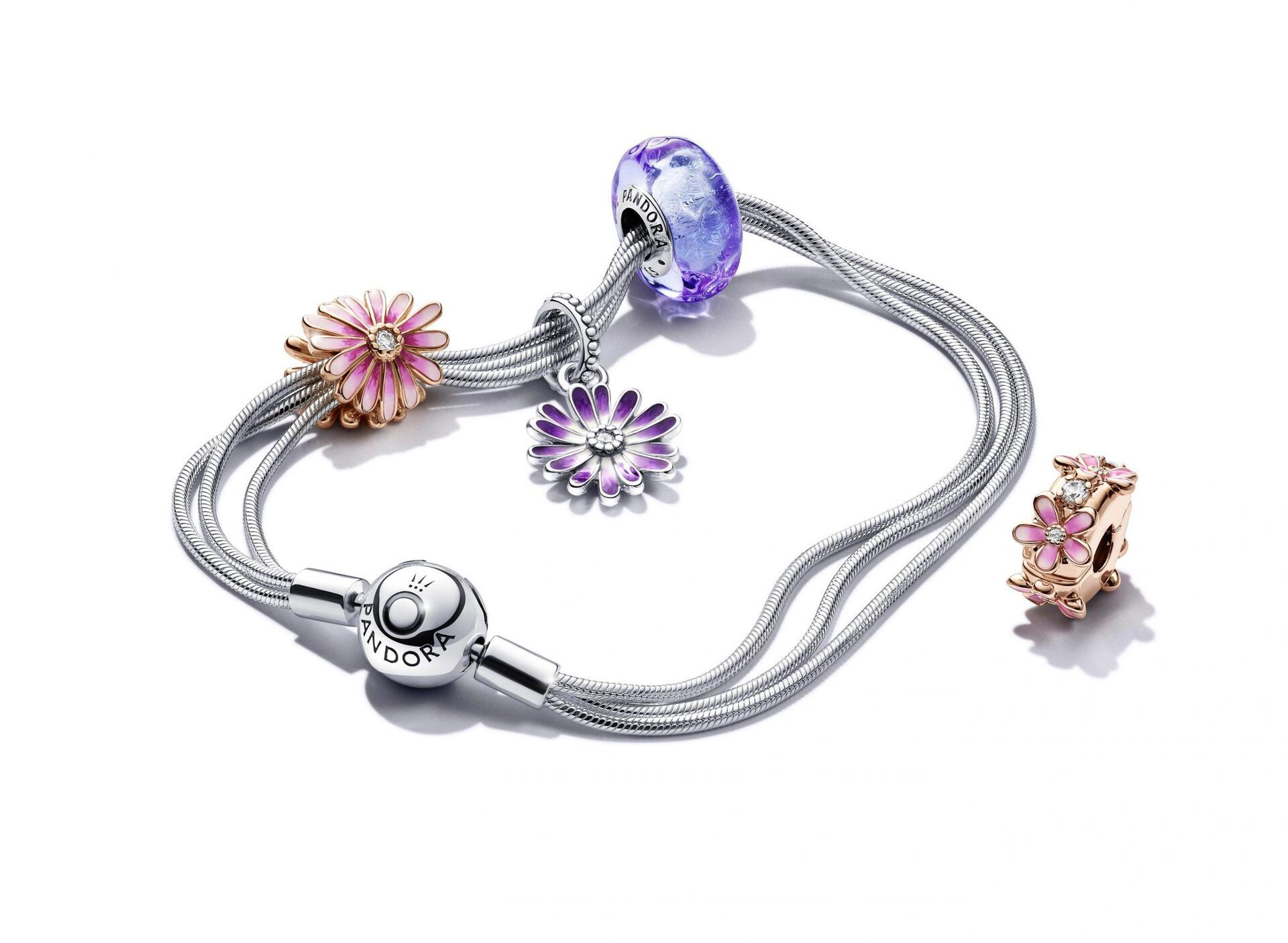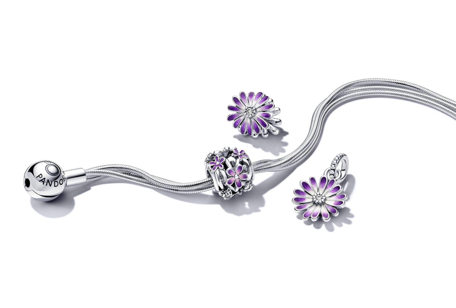 Προσθέστε μια ανάλαφρη πινελιά σε κάθε ανοιξιάτικη εμφάνιση με τα νέα κομψά δαχτυλίδια και charms της PANDORA. Αυτή τη σεζόν η νέα μωβ απόχρωση κάνει την παρθενική της εμφάνιση στα purple charms, σχέδια που συμπληρώνουν μοναδικά το στυλ Pink Daisy.