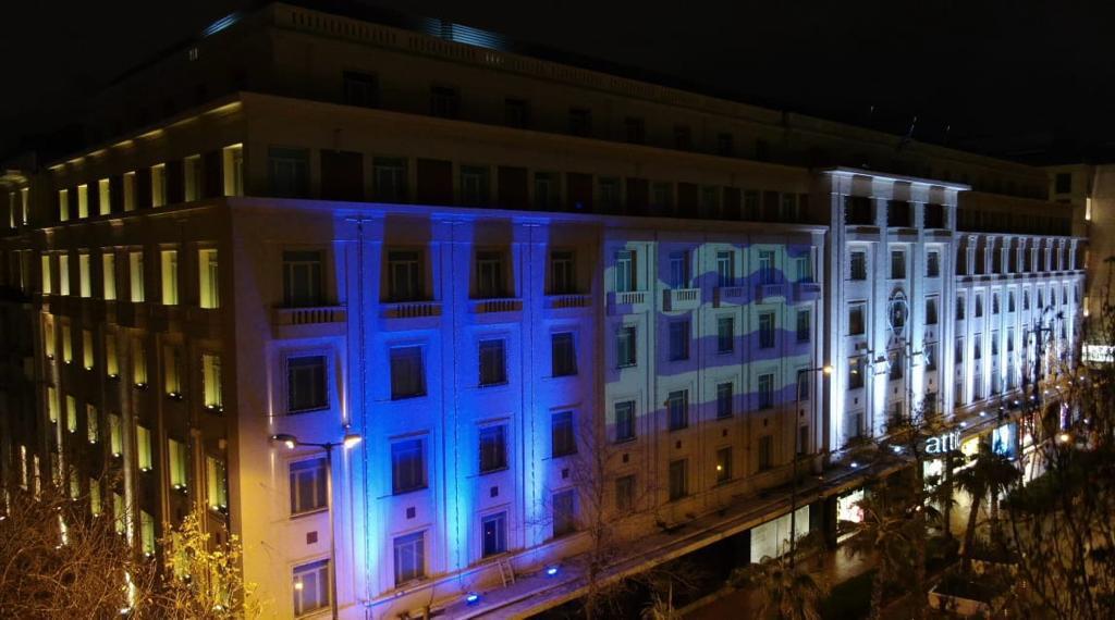 Η πρόσοψη του ιστορικού κτηρίου της πρωτεύουσας, στη συμβολή των οδών Βουκουρεστίου και Πανεπιστημίου, λούζεται με λευκό και γαλάζιο φως, αποτίοντας φόρο τιμής στην επέτειο των 200 χρόνων από την Ελληνική Επανάσταση.
