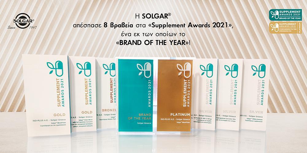 Εξαιρετικά γνωστή στον χώρο αυτό η εταιρία Solgar πρωταγωνίστησε στην πρόσφατη απονομή των «Supplement Awards 2021», καθώς διακρίθηκε με συνολικά οκτώ βραβεία, ένα εκ των οποίων το «Brand of the Year», επισφραγίζοντας έτσι την ηγετική της θέση στον κλάδο των συμπληρωμάτων διατροφής!