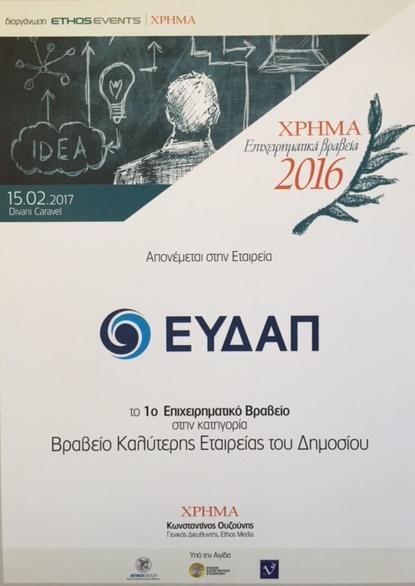 Το βραβείο για λογαριασμό της ΕΥΔΑΠ, παρέλαβε ο Πρόεδρος Διοικητικού Συμβουλίου της Εταιρείας κ. Κωνσταντίνος Παπαδόπουλος, ο οποίος μεταξύ άλλων δήλωσε: «Όλοι οι παρευρισκόμενοι γνωρίζετε την ΕΥΔΑΠ, καθώς όλοι είστε χρήστες των υπηρεσιών που παρέχει η Εταιρεία και κυρίως του βασικού προϊόντος της, του νερού. Για όσους δεν το χρησιμοποιούν, σας προτείνω ανεπιφύλακτα να το κάνετε, καθώς είναι ένα από τα ποιοτικότερα νερά της Ευρώπης. Πέρα απ’ αυτό, η ΕΥΔΑΠ, στο πλαίσιο της Εταιρικής Κοινωνικής Ευθύνης, επιστρέφει μέρος των κερδών της στην κοινωνία, με δράσεις κοινωνικού, περιβαλλοντικού και πολιτισμικού περιεχομένου, αποδεικνύοντας στην πράξη τον ανθρωποκεντρικό χαρακτήρα της».