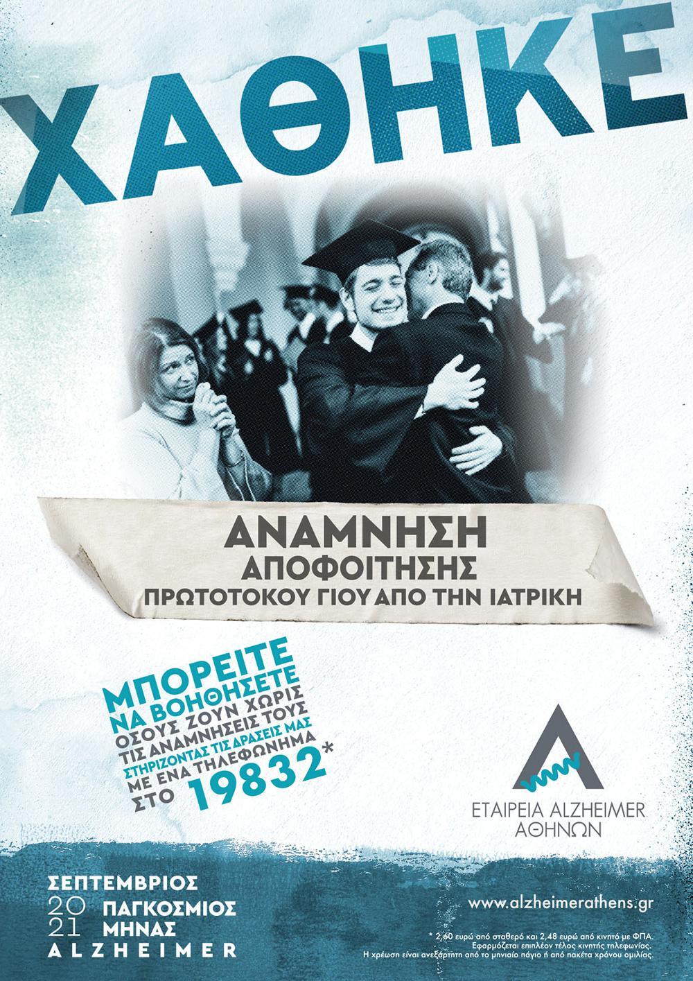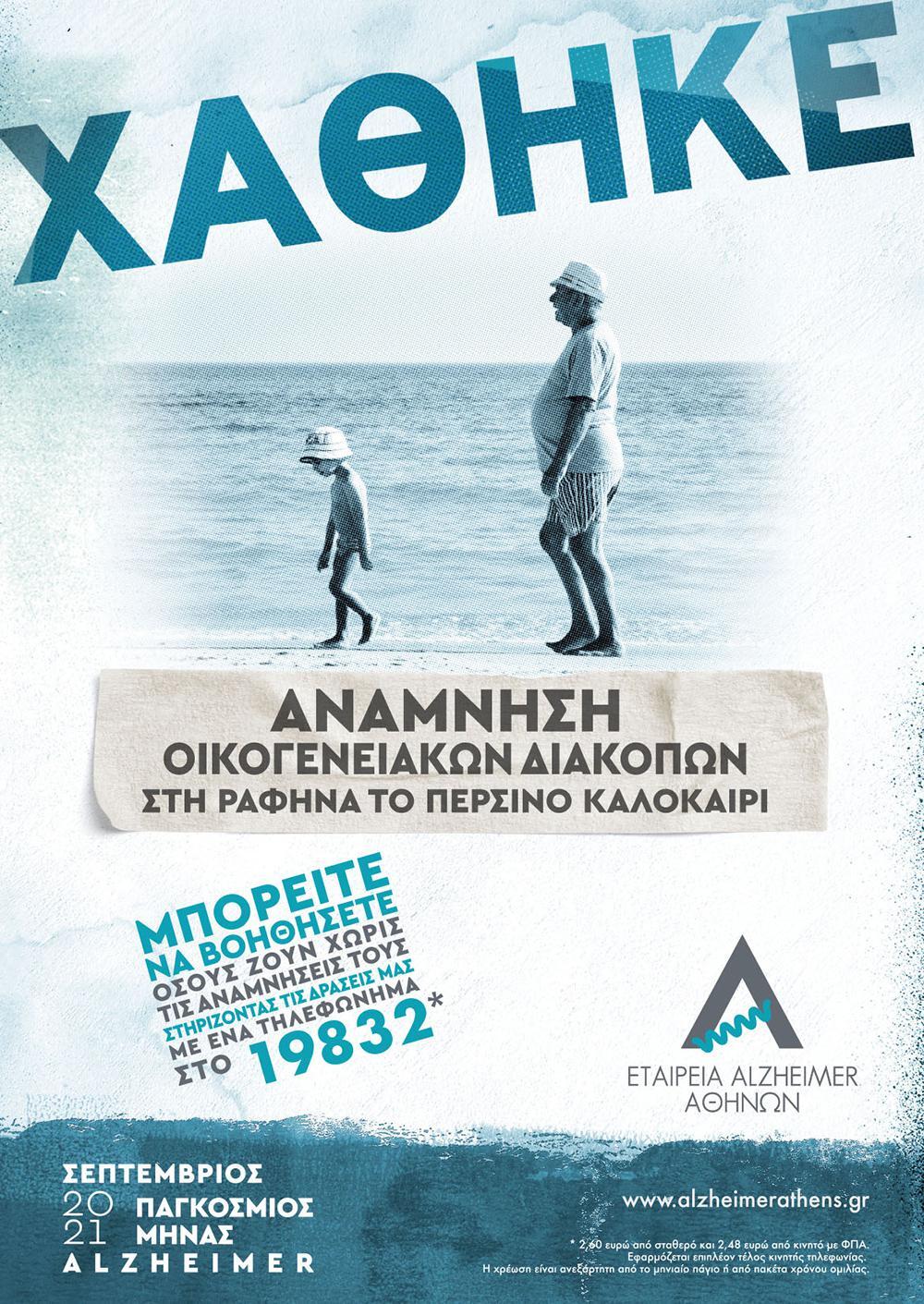 Στο πλαίσιο του φετινού Παγκόσμιου Μήνα Αλτσχάιμερ, η Εταιρεία Alzheimer Αθηνών διοργανώνει εκστρατεία ευαισθητοποίησης με θέμα «Χαμένες Αναμνήσεις», μέσα από την οποία ζητά να συμμετέχουμε όλοι στη στήριξη όσων συνανθρώπων μας αναγκάζονται να μάθουν να ζουν χωρίς τις αναμνήσεις τους, ενισχύοντας το έργο της. Με ένα απλό τηλεφώνημα στο 19832, με μια χαμηλή τελική χρέωση μόνο 2,60 ευρώ από σταθερό και 2,48 ευρώ από κινητό, συνεισφέρουμε όλοι στην επέκταση των δράσεων της εταιρείας, που από το 2002 στηρίζει έμπρακτα τα άτομα με άνοια, τις οικογένειες και τους φροντιστές τους με σειρά σημαντικών δράσεων και πρωτοβουλιών.