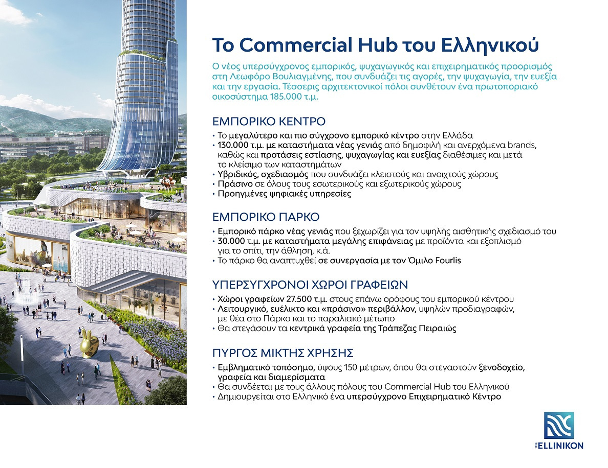 Επίσης, στο εμπορικό πάρκο 30.000 τ.μ. που θα αναπτυχθεί στο Commercial Hub, σε συνεργασία με τον Όμιλο Fourlis, οι επισκέπτες θα βρουν καταστήματα μεγάλης επιφάνειας, διεθνών brands με προϊόντα και εξοπλισμό για το σπίτι, την άθληση, κ.ά., απολαμβάνοντας μία ολοκληρωμένη αγοραστική εμπειρία.