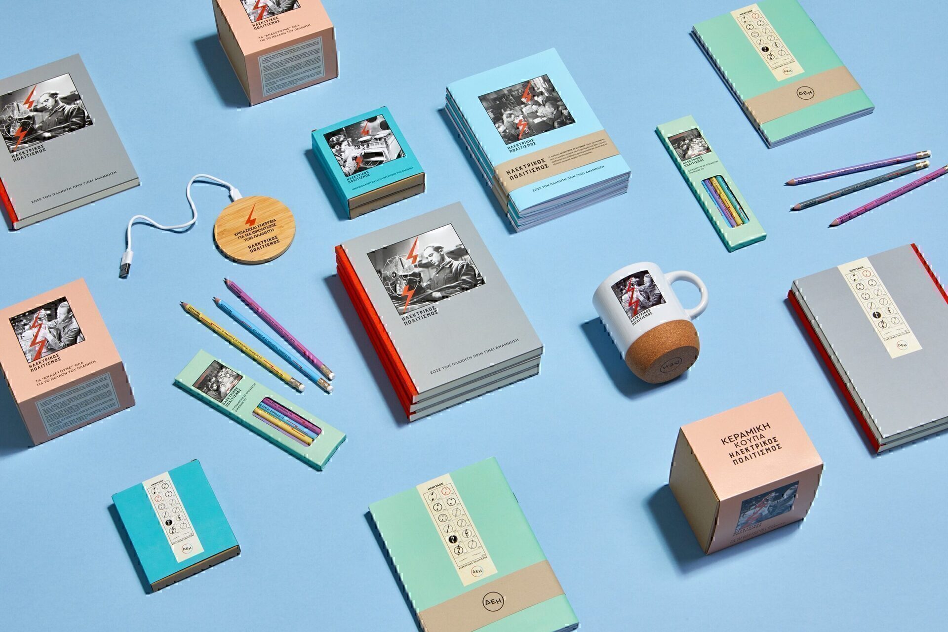 Τα προϊόντα της συλλογής περιλαμβάνουν μεταξύ άλλων είδη γραφείου, όπως τετράδια, σημειωματάρια, κούπες, καθώς και το σετ έξι wood–free μολυβιών συνθετικής ρητίνης, κατασκευασμένο με 46% ανακυκλωμένο υλικό. Στην επιφάνεια κάθε μολυβιού υπάρχει εκτυπωμένος ο κεραυνός-λογότυπο της ΔΕΗ του 1954.