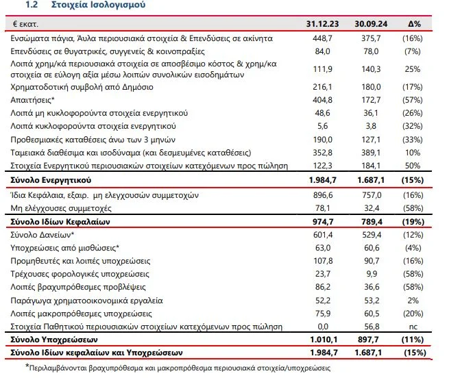 Καθαρή ρευστότητα Ομίλου1 : €359 εκατ. στις 30.09.2024 έναντι €3022 εκατ. στις 31.12.2023.