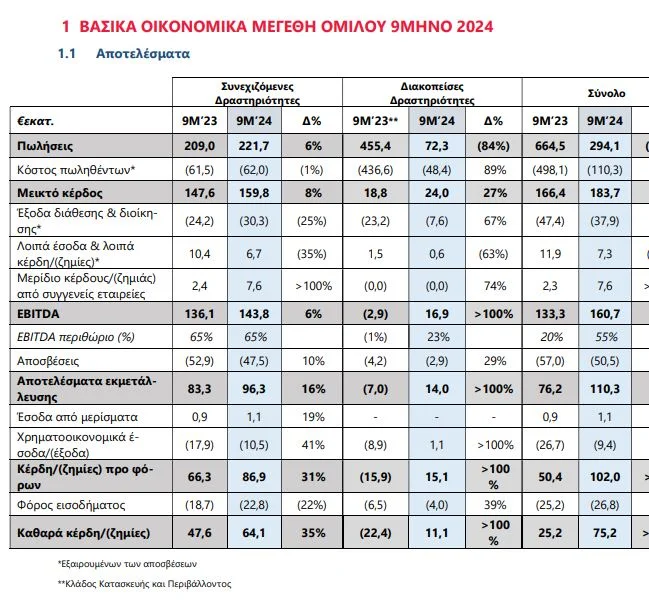 Βασικά Οικονομικά μεγέθη Ομίλου για το 9Μ 2024 από Συνεχιζόμενες Δραστηριότητες (Σ.Δ.).